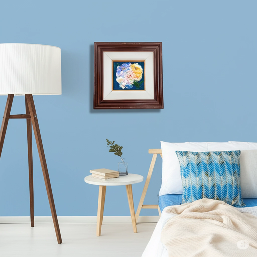 A obra representa um buquê compacto de flores coloridas (em tons de azul, amarelo, branco e rosa), centralizado sobre fundo azul escuro