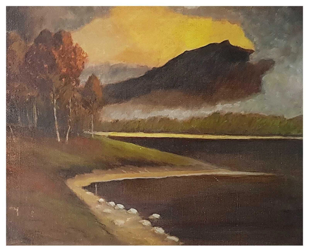 Paisagem natural com montanhas, lago ou rio e vegetação outonal.